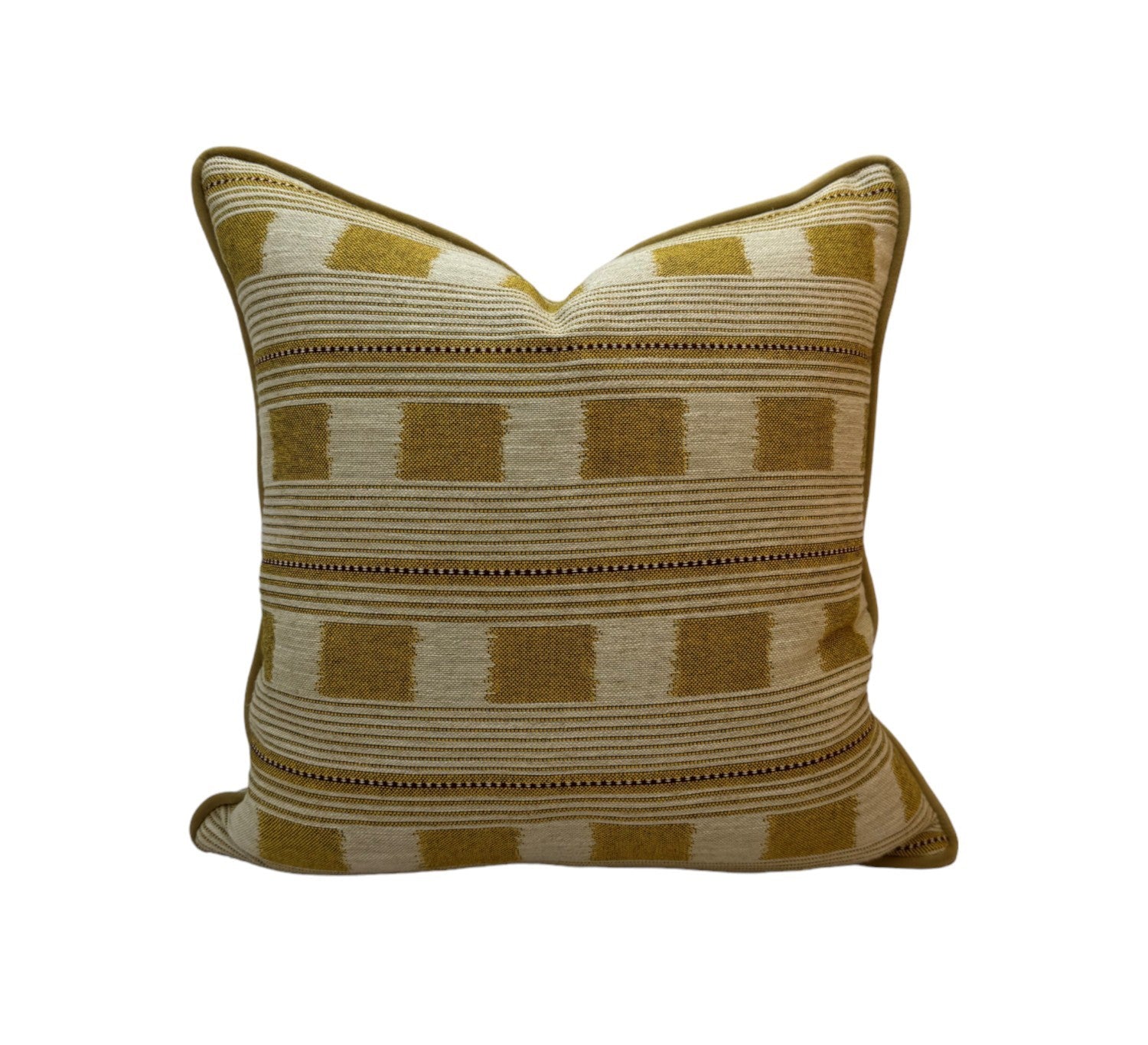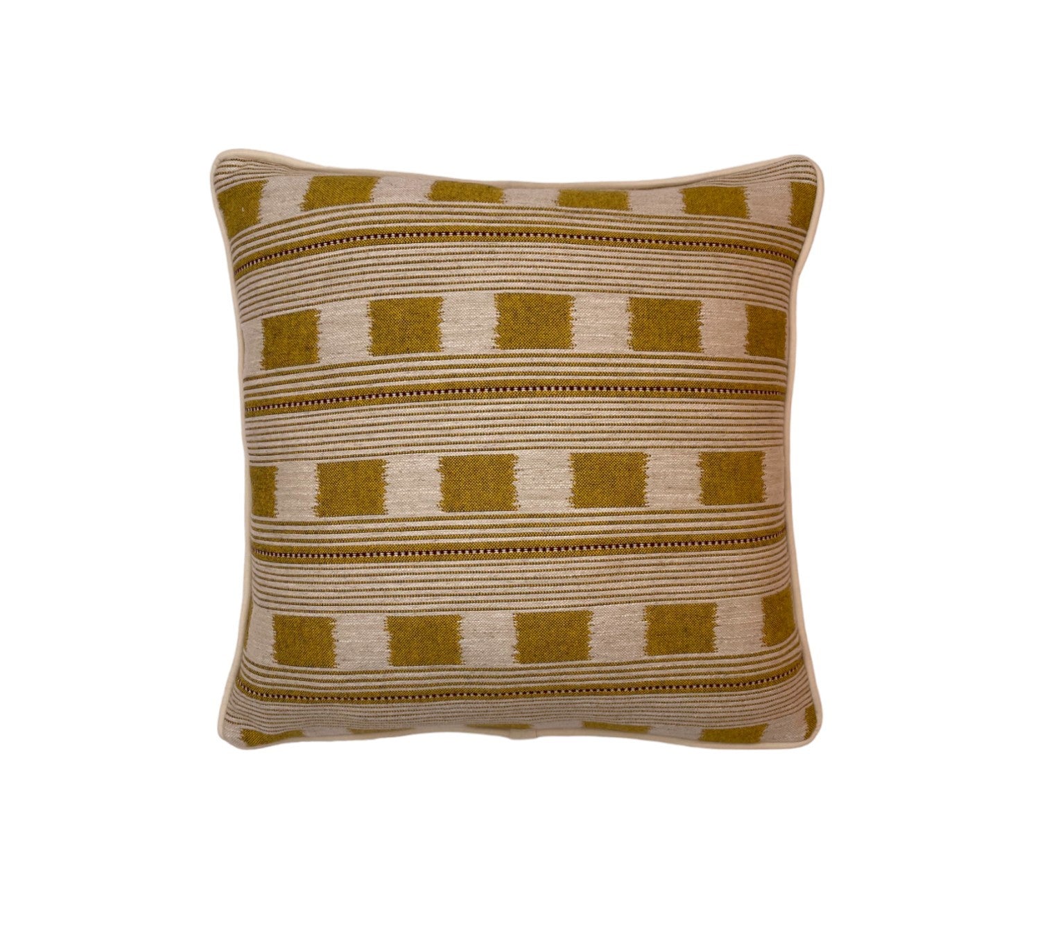 This Christopher Farr Lost and Found cushion in Lemon is made with a complimentary plain linen back and can be made with a plain linen piping or yellow velvet piping.