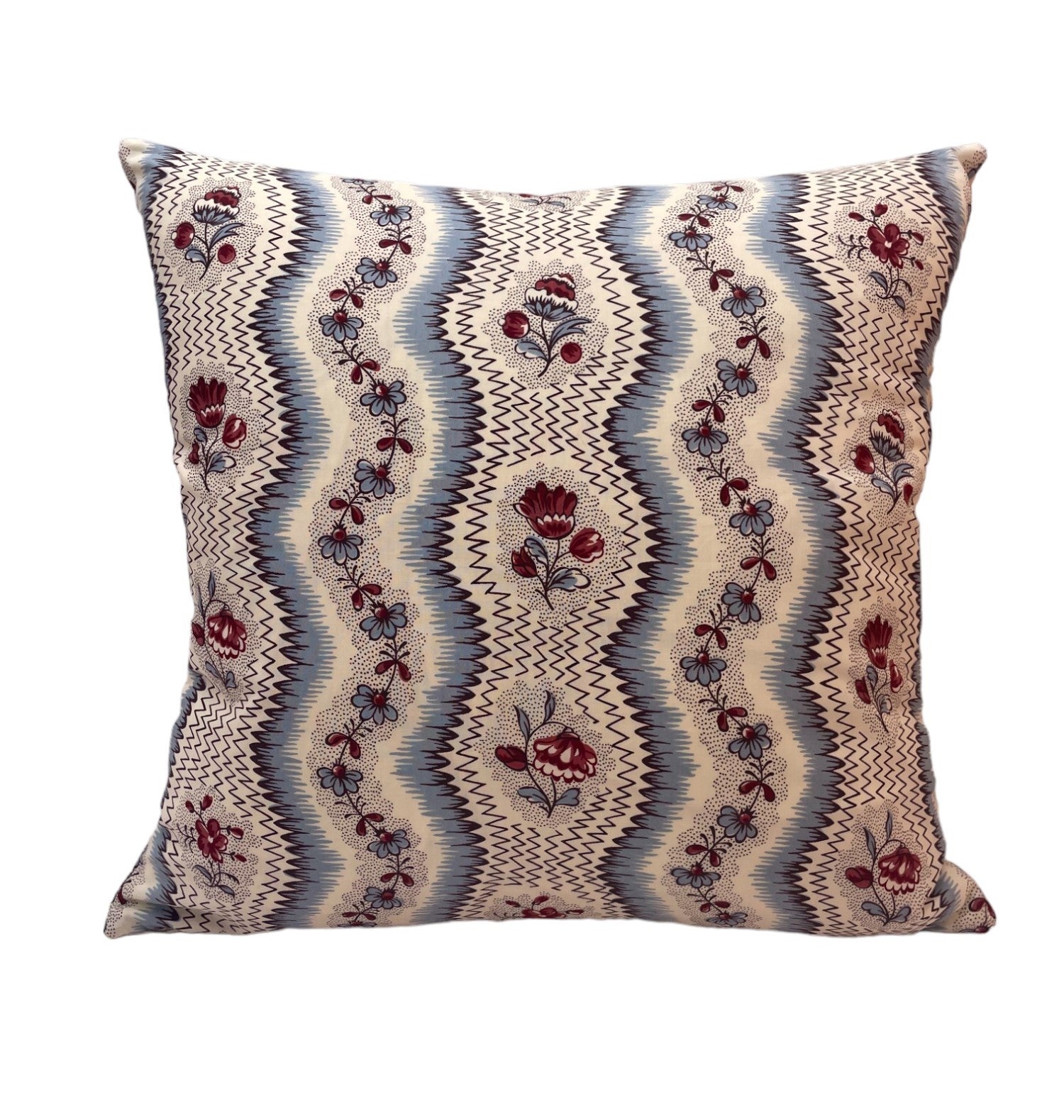 This Pierre Frey Greuze cushion in Bleu Rouge is made with a plain back and can be made with a choice of self-piping, red velvet piping or no piping.